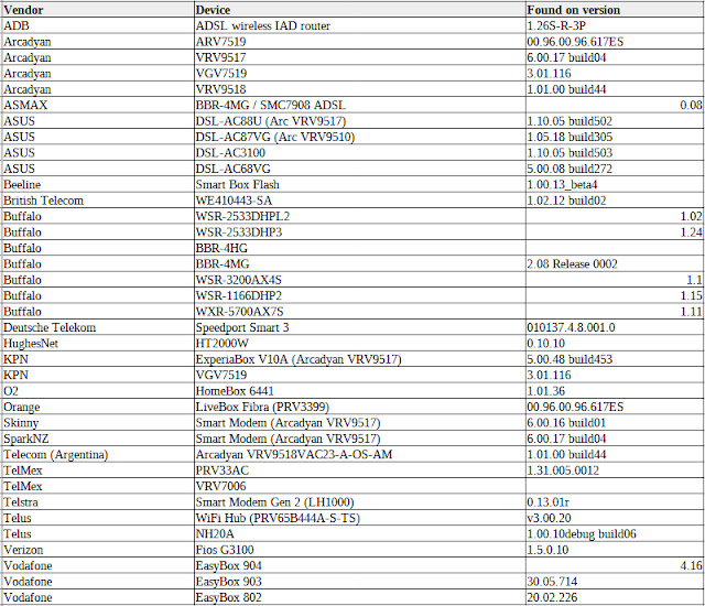 Los dispositivos vulnerables incluyen docenas de modelos de enrutadores de múltiples proveedores e ISP, incluidos Asus, British Telecom, Deutsche Telekom, Orange, O2 (Telefónica), Verizon, Vodafone, Telstra y Telus. Según la cantidad de modelos de enrutadores y la larga lista de proveedores afectados por este error, es probable que la cantidad total de dispositivos expuestos a ataques llegue a millones de routers.